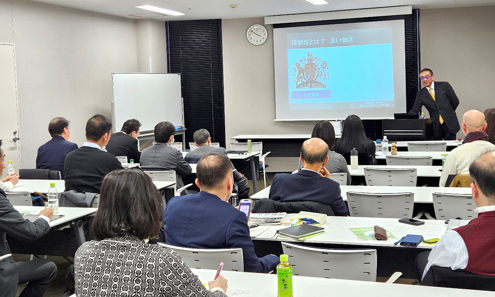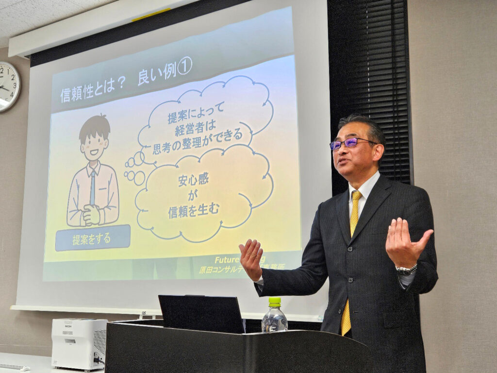 今回は、バリュー経営を通し、コンサルタントに必要な信用、専門性、情報収集力、分析力、プレゼン力について実例から“ありがちな失敗”、“良い例”を解説していただきました。中小企業の値上対策、価格交渉、トランプ関税対策など知見の得られる講演内容で、参加者からは、「今後のコンサルティングに生かせる具体的な学びになった」との声もいただきました。 講演後の懇親会では原田講師を囲み、和気あいあいと交流を深めました。