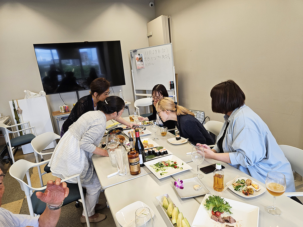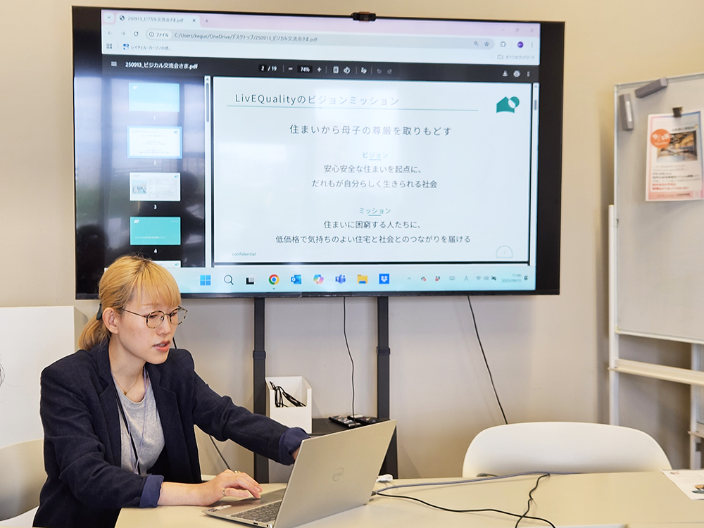 サブスピーチは、認定NPO LivEQuality HUB(リブクオリティ・ハブ)の森みちかさんに、DVや就業環境の悪化、外国籍などさまざまな理由で「安心して眠ることができる住まい」をもてないシングルマザーに対して、住まいと暮らしのサポートを行なっている、同NPOの取組を紹介していただきました。スピーチの後は、和気あいあいとパーティータイム。参加者が、自身や自社の事業や活動を紹介し合うなど、今回もビジカルで楽しく、有意義な交流会となりました。